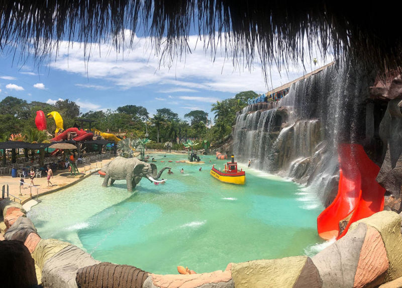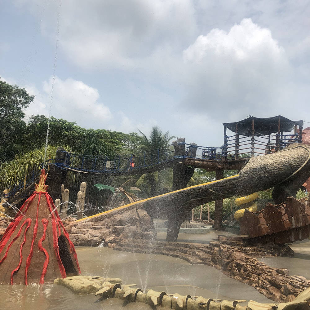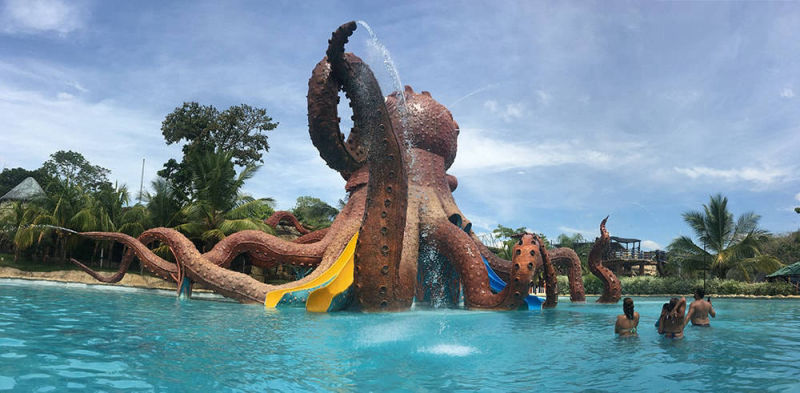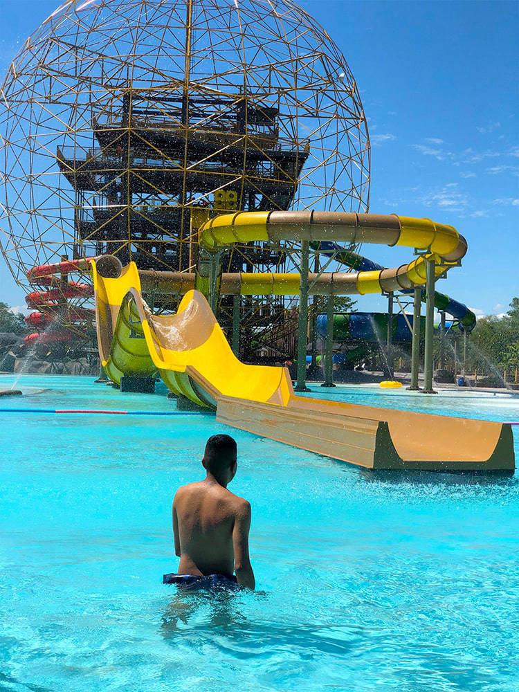 Cuatro toboganes: dos al aire libre y dos oscuros, tres jacuzzis, un barco antiguo con seis cañones de agua y un cruce de puente sobre lotos flotantes esperan por ti.